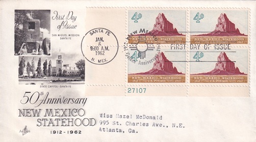 | These cacheted covers are for the first day of issue of the 4 cents New Mexico Statehood postage stamp. Special hand pictorial & slogan cancellations: "SANTA FE, N.MEX. JAN 6 1962 | FIRST DAY OF ISSUE | ( New Mexico Golden Anniversary 1912 1962 )". |
