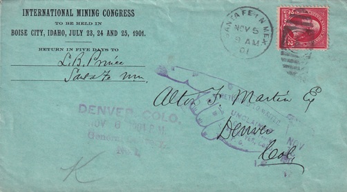![]() | Hand cancellation: "SANTA FE, N.MEX. NOV 5 '01 ( 1 )". Has "DENVER, COLO. NOV 6 1901 P.M. General Delivery, No. 1." and "RETURNED TO WRITER. UNCLAIMED ... NOV 13 1901" pointing hand auxiliary markings. [TPC] |