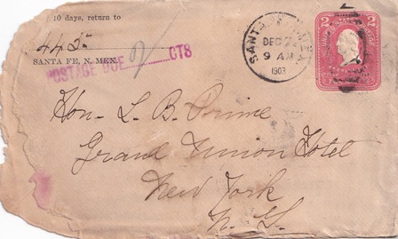![]() | Hand cancellation: "SANTA FE, N.MEX. DEC 10 1904 ( 1 )". [TPC] |