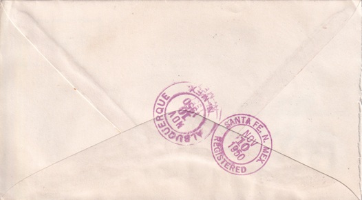 | Hand cancellation on back: "REGISTERED, SANTA FE, N. MEX. NOV 10 1950". Has "REGISTERED NO." and "Return Receipt Requested. Fee Paid:" auxiliary markings on front. |