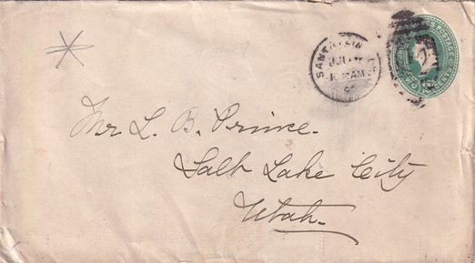 ![]() | Hand cancellation: "SANTA FE, N.MEX. APR 18 1892". Has "General Delivery, APR 22 1892 10" and "ADVERTISED MAY 7 1892 at Ogden, Utah" auxiliary markings. [TPC] |