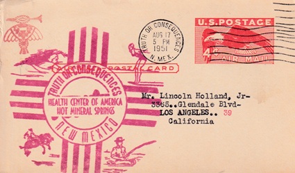 | Machine cancellation: "TRUTH OR CONSEQUENCES, N.MEX. AUG 17 1951". |