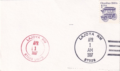 | Two different hand cancellations: "LAJOYA, NM 87028 APR 1 1997", and "LAJOYA, NM 87028 USPS APR 1 1997". |