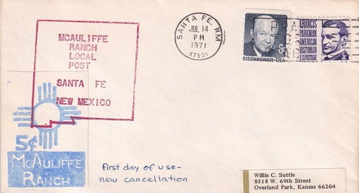 ![]() | This cover features the McAuliffe Ranch Local Post "Santa Fe Trail 150 Years" 5 cents postage stamp. Local post hand cancellations: "MCAULIFFE RANCH LOCAL POST SANTA FE NEW MEXICO" and "MAIL CARRIED ON THE SANTA FE TRAIL MRLF POSTAL ROUTE". USPS hand cancellation: "SANTA FE, NM NOV 30 1971". |