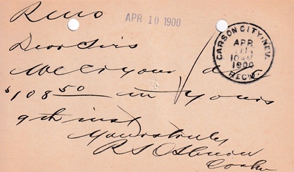 | Hand cancellation on back: "REC'D., CARSON CITY, NEV. APR 11 1900". |