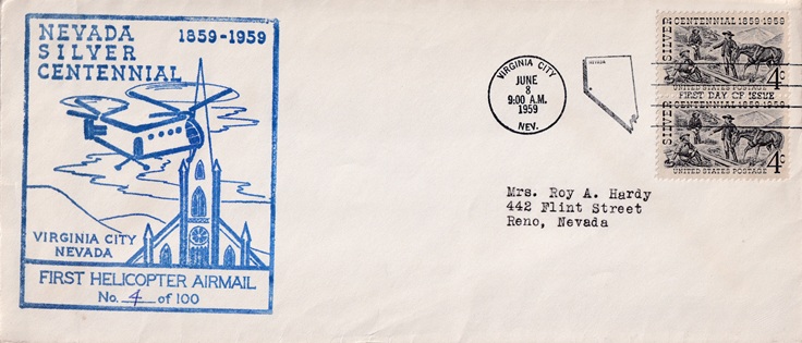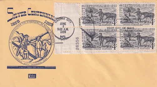| Four special hand pictorial & slogan cancellations: "VIRGINIA CITY, NEV. JUN 8 1959 | FIRST DAY OF ISSUE |". |