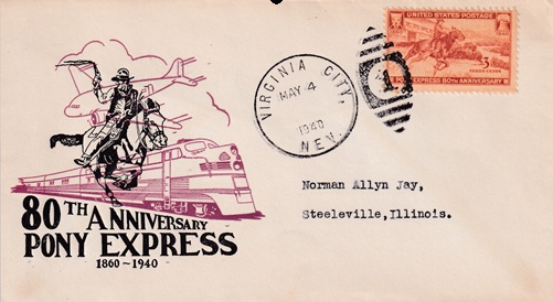 ![]() | Hand cancellation: "VIRGINIA CITY, NEV. MAY 4 1940 ( 1 )". |