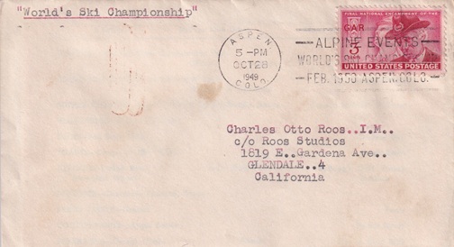 |  | Special machine slogan cancellation: "ASPEN, COLO. OCT 28 1949 | ALPINE EVENTS - WORLD'S SKI CHAMPIONSHIP - FEB. 1950 ASPEN, COLO. |". |