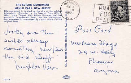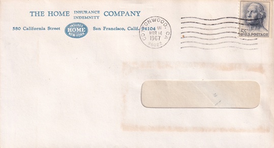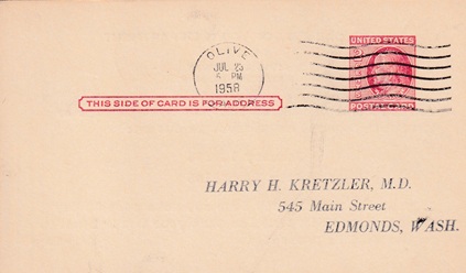 |  | Hand cancellation: "MADRONE, CALIF. OCT 9" [1958]. [Machine cancellation on back has 1958 date"]. |