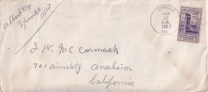 |  | Hand cancellation: "SPRUCE, MO. NOV 17 1939". |